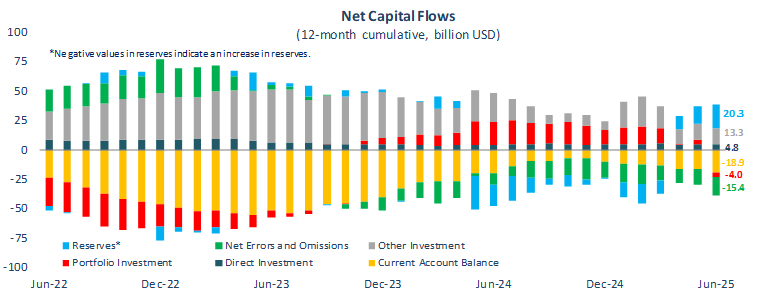 The current account balance posted a deficit of 2 billion USD in June, exceeding market expectations. Market expectations were around 1.38 billion USD. In the January-June period, the current deficit increased by 60.8% yoy to 23 billion USD, while the 12-month cumulative current account deficit reached 19 billion USD, the highest level in one year.