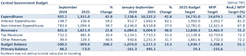 busra.ceylan@isbank.com.trCentral government budget posted a deficit of 309.6 billion TRY in September.
