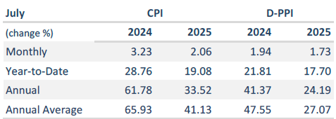 Monthly CPI inflation reached the highest level in the last three months with 2.06% in July. However, it was still below market expectations of 2.40%. Annual CPI inflation continued to decline due to the high base effect, falling to 33.52%.
